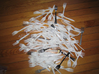 I tried to save every single one, although that’s actually quite hard. The inclination to simply throw everything away when you’re done eating off disposables is VERY hard to beat. So I threw away a few. I usually figured it out the moment after, but, rather than risk having somebody see their rabbi picking a dirty fork out of the garbage, I found a way to substitute somebody else’s used fork for mine - my daughter Hannah happily volunteered several. In any case, I used almost all of these forks personally, and probably the number is pretty accurate.